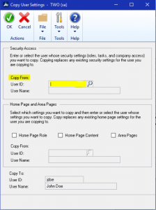 - Recommendation: Copy security from another user who has a similar role/position with Dynamics GP. This can save a lot of time for some customers. In the screenshot below I have circled and highlighted this option. This will copy reports, window access, company access and even home page layout if needed: