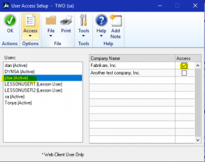 In the above window, select the new user (as I have). Then select a company to which the user has been given access. It will display a list of Roles. Here is the tricky part: Unless you drill down on each role (double click) and look at the tasks that are assigned to that role and then drill down again on a task to see what operations are assigned to the task, you won’t know what windows and processes access that role gives the user. This is just another example of why it is much easier to copy security rather than trying to use trial and error. You might give a user the Accounting Manager role only to find out they need access to a window that role doesn’t give them. It is easy to fix, however, by adding that window access to their security role or by creating a new role. Contact your Dynamics GP Partner for security questions as these situations can become complicated.