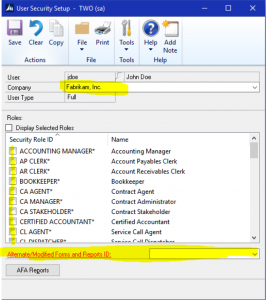 - In the above User Security Window, you also want to select an Alternate/Modified Forms and Reports ID for the user. The Alternate/Modified Forms and Reports ID determines which windows and reports are used (non-modified or modified) for a user in this company. For example, let’s say the Sales Order has been modified to show the company logo and you want this user to print the same modified Sales Order that other users are printing. Simply make sure they have the same Alternate/Modified Forms and Reports ID as the other users. Alternately, you can click the Alternate/Modified Forms and Reports link to go into that setup and choose if you want a specific report to print as the modified version or the canned version for this new user in this company.